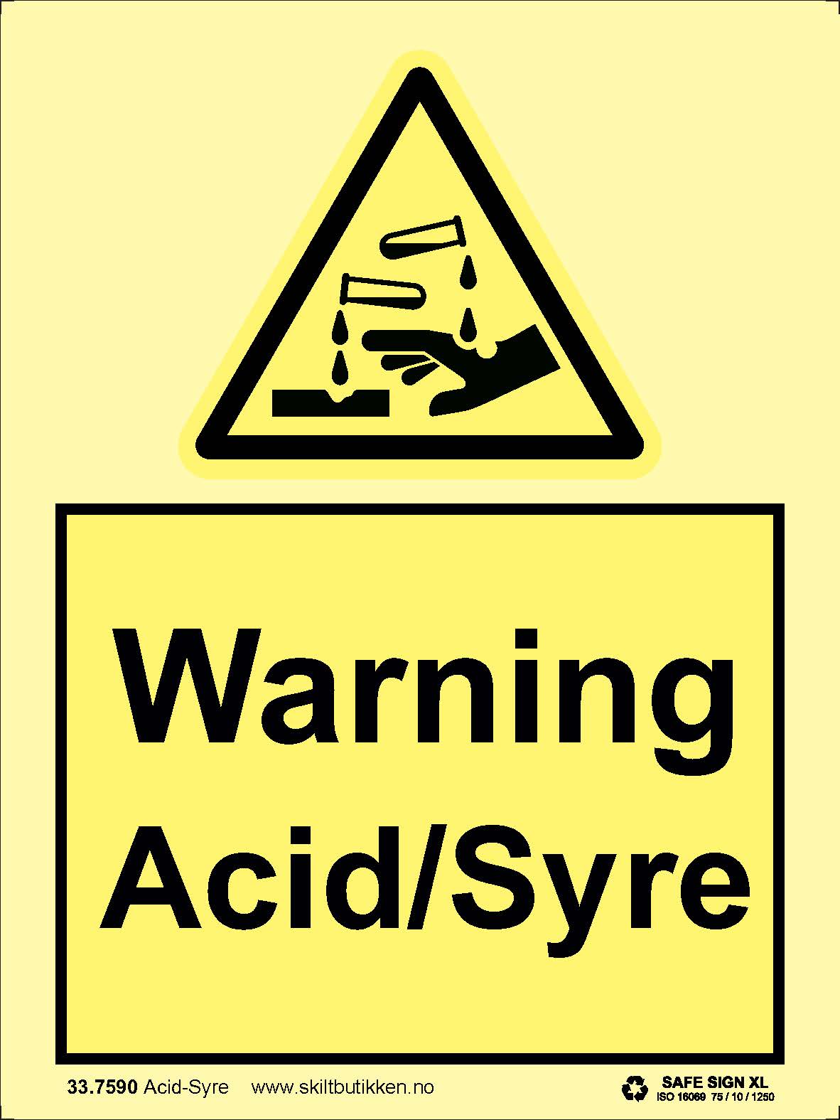Fareskilt; Warning - Acid / Syre, 20 x 30 cm, varenr 337590